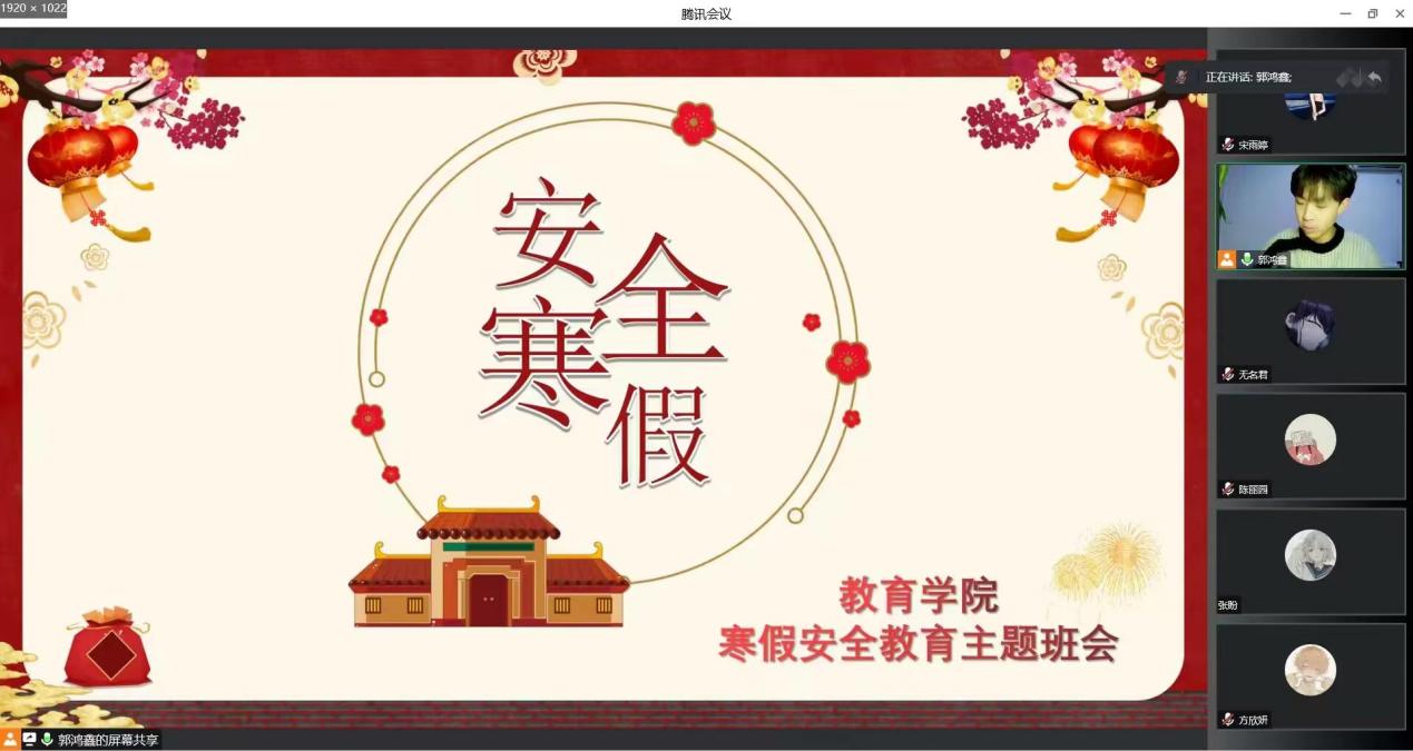 为进一步做好学生假期安全教育工作,落实安全教育的常态化,保障假期安全工作不松懈,确保同学们度过一个平安、快乐、有意义的寒假,2023年1月14日,best365足球官网全体辅导员组织各班同学开展了线上寒假安全教育主题班会活动。