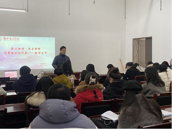 会上,秦祥老师作为上学年度校级优秀班主任代表分享他在班主任工作中的经验和体会。秦祥结合自身工作情况分享三个方面的经验:1、高校班主任教师要坚持落实立德树人根本任务,以德铸魂,将德育贯穿到主题班会和学生的日常管理、指导全过程中;2、搭建专业赋能平台,邀请淮北本地非遗传承人分享非遗文化、传承手工匠心;3、组织学生开展专业实践活动,常态化开展粉笔字练习和比赛并展出,提高学生师范生技能。