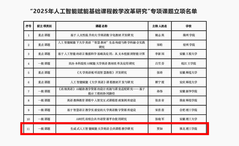 在安徽省“2025年人工智能赋能基础课程教学改革研究”专项课题申报活动中,best365足球官网青年教师贾如主持的《生成式人工智能赋能大学英语公共课程教学研究》成功获批立项。