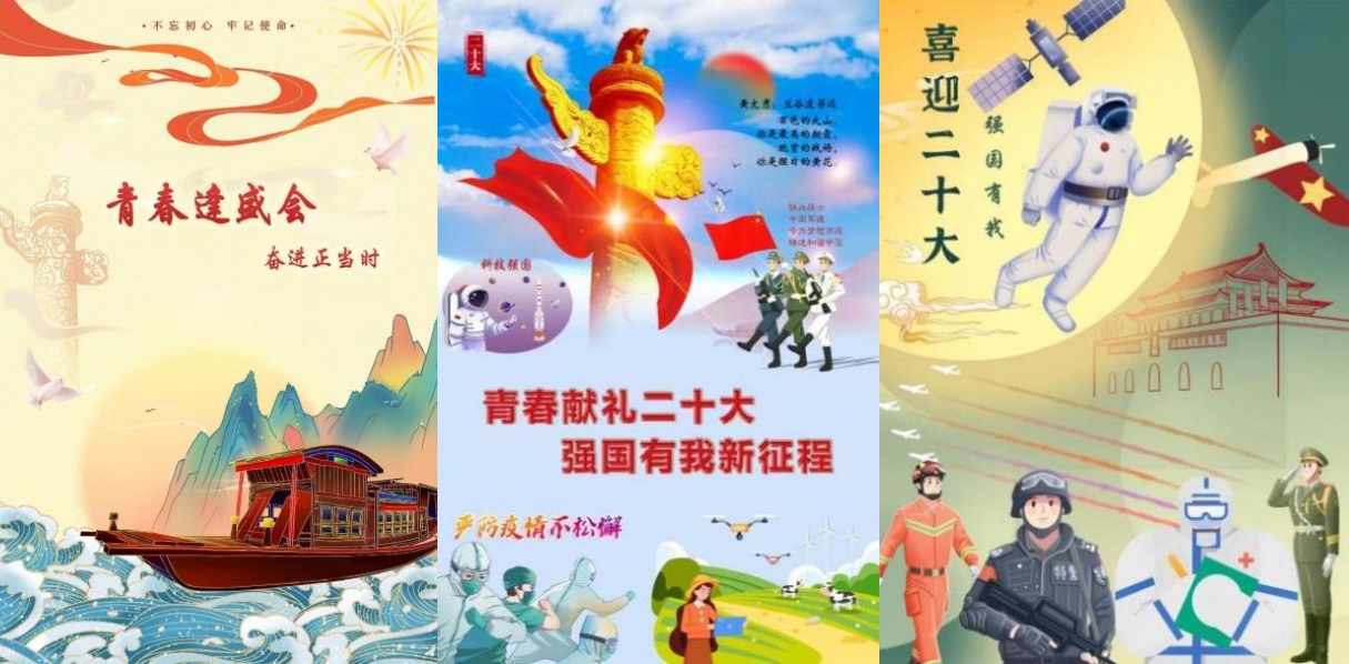 参赛同学围绕学习二十大精神、歌颂党和国家以及在时代洪流中着眼当下的亲身感悟及启发进行设计,大气洒脱的《青春献礼二十大》,灵动明媚的《福盈华夏,乐满中华》,深刻严谨的《敢于逐梦,心向未来》,都展现了同学们从党的百年奋斗历程中汲取的智慧力量和对蓬勃发展的祖国的热爱,体现了同学们对于伟大建党精神的解读与认识。