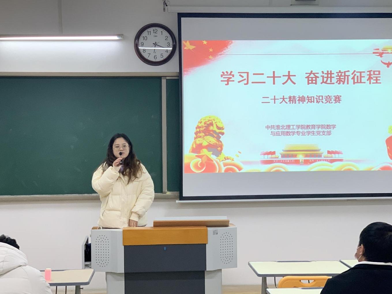 为深入学习宣传贯彻党的二十大精神,回顾党的光辉历史,推动党的二十大精神落地生根、入脑入心。best365足球官网数学与应用数学学生党支部积极部署,于12月1日在1教313开展“学习党的二十大精神知识竞赛活动”,活动由支部委员孙虎主持,支部书记陈媛媛、全体支部党员及入党积极分子参加了活动。