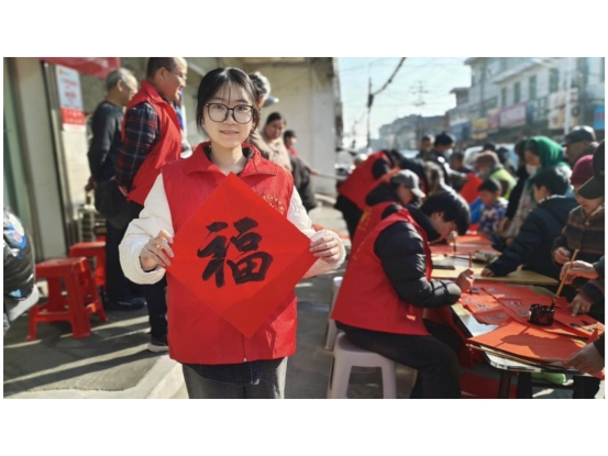 2022级数学与应用数学2班林翊同学参加了社区写春联活动。“墨香入社区,吉语暖人心。”把美好的祝福融入春联,以热情的态度温暖人心。凭借端正的字体林翊同学获得社区人员一致好评。不仅如此,林翊同学耐心倾听老人需求,为他们挑选合适的春联,幽幽的墨色为欢乐、祥和的节日增添缕缕墨香,一张张“中国红”让寒冬又多几分暖意。