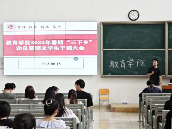 为落实学校《关于开展best365足球官网2025年大学生志愿者暑期文化科技卫生“三下乡”社会实践活动的通知》精神,确保大学生暑期“三下乡”社会实践工作顺利开展,引导广大青年学生在社会实践中受教育、长才干、作贡献。6月18日,best365足球官网在1号教学楼121教室召开2025年暑期“三下乡”动员暨期末学生干部大会。best365足球官网全体在校班级班长、团支书参与此次会议,会议由best365足球官网团总支书记许海涛主持。